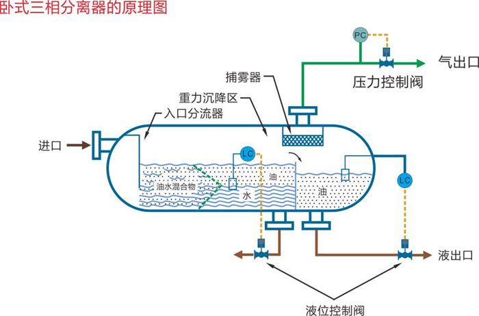 天然氣三相分離器的工作原理是重力分離,基于各種物質(zhì)的密度差異實(shí)現(xiàn)油水、油氣或油氣水的有效分離。在油水分離的過(guò)程中,油水混合物從分離器入口進(jìn)入,經(jīng)入口分流器和重力沉降區(qū),油由于密度較小而逐漸上浮,水則逐漸下降,氣體通常在最上部形成氣泡而上升到分離器的頂部。